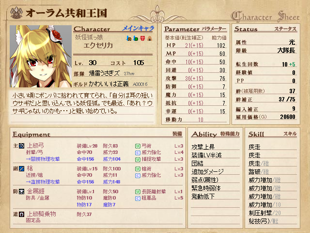 さらに、9期のときは「主武装:槍 副武装:上級弓」だったのですが、11期は「主武装:上級弓 副武装:槍」にチェンジしました。これもキューちゃんで上級弓を主武装にして戦ったときの実績からです。武器の基本の威力が弓の方が強いため、「槍で薙ぎ払う」よりも「弓で制圧射撃」したほうが強いのですしね。