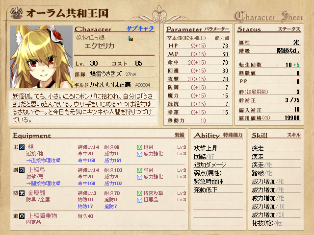 当初は「槍+両手化」だったのですが、途中で昔から持っていた弓術2LV:弓を持たせてみた所、これが意外に便利。「追加攻撃+威力増加5」の組み合わせはやっぱり強いですね。